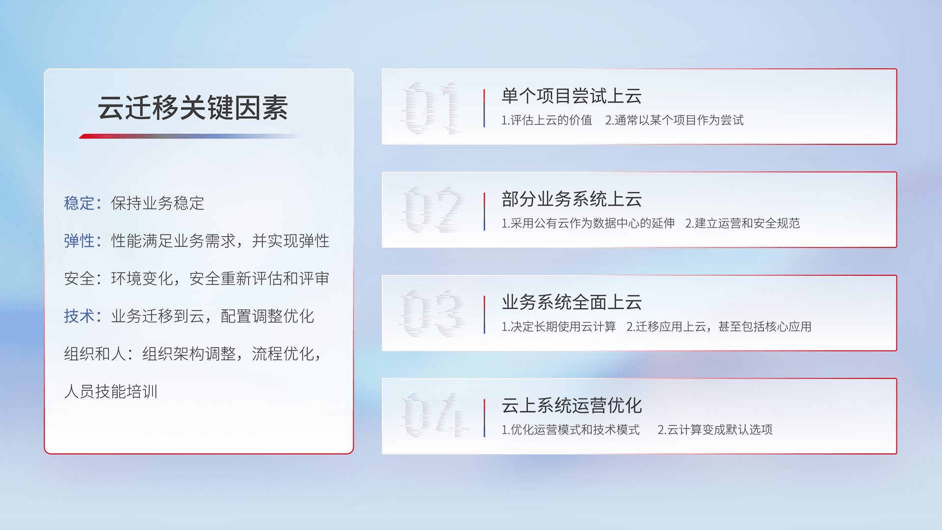 结合实际业务,,,,从规划设计、、、云平台选型、、云原生改造、、、、数据迁移、、集成交付,,,,迁移全过程为客户识别最佳上云路径,,做好风险识别管理,,设计网络架构、、身份权限、、安全审计合规、、操作审计、、、、日志审计、、、监控告警策略、、多站点容灾设计等,,对云上基础设施进行整体规划,,,提升IT治理水平,,,以满足弹性、、、、高可用、、、高性能的需求。。。