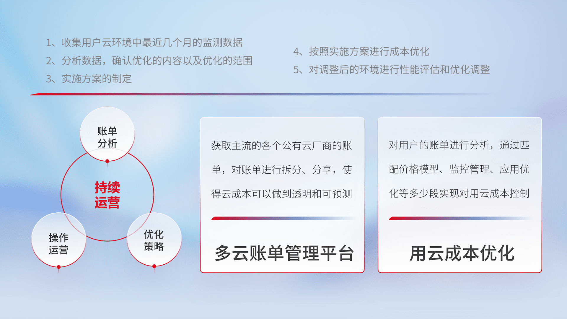 通过多云纳管,,,以统一的资源数据模型把客户的云资源进行抽象和封装,,进而实现对多云资源的统一操作,,,,保障云资源管理的可靠性、、稳定性与可用性。。量身定制化运维内容,,,,配置、、开发运维、、补丁管理、、、备份、、监控、、、、认证和访问管理、、、、审计和日常巡检等,,保障在用云过程中的可靠度,,稳定度以及高可用率。。。