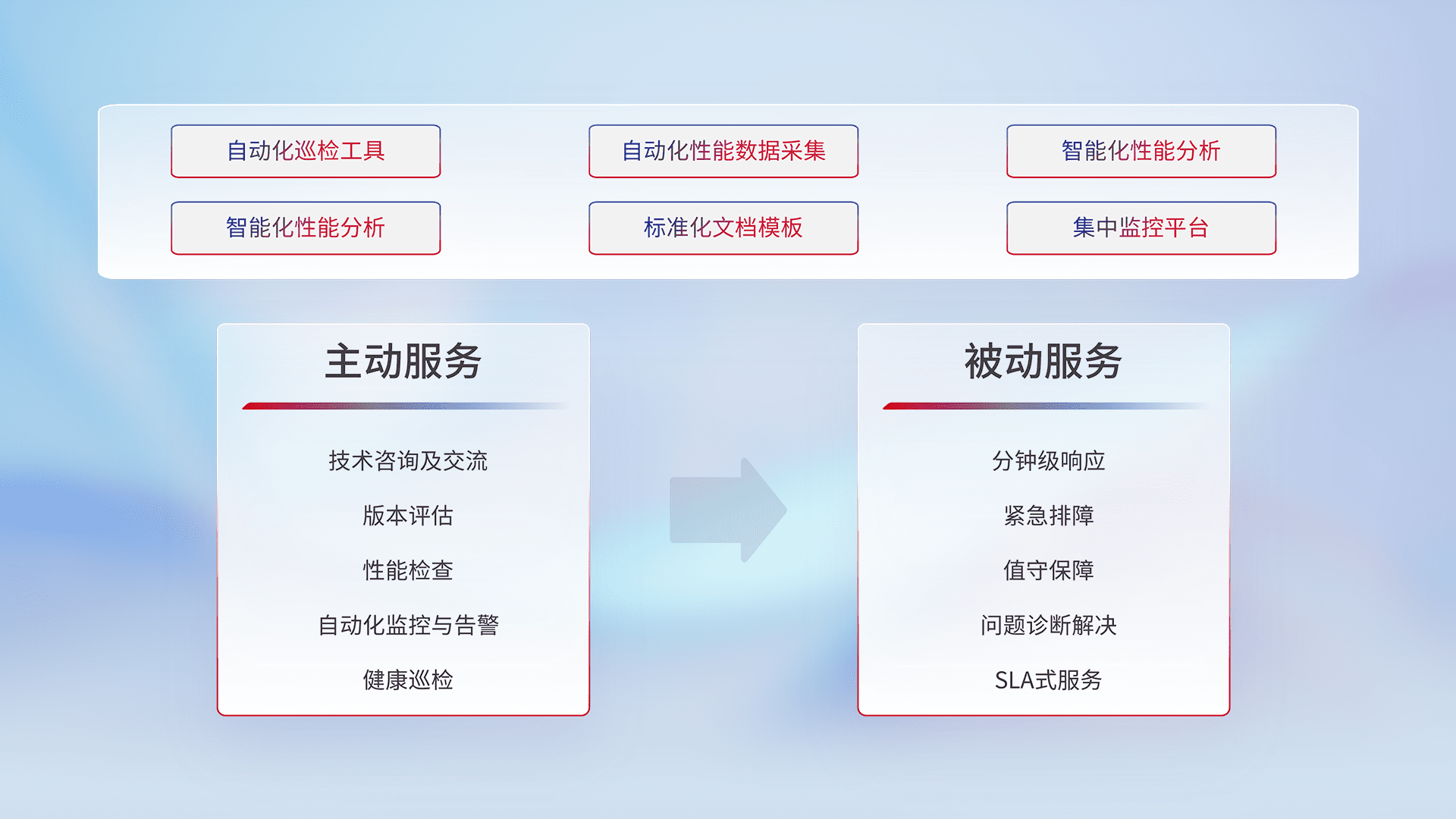 智能化工具和标准化文档,,保障服务质量,,,,提供主动服务(包含技术咨询、、版本评估、、、、性能检查、、、自动化监控与告警、、健康巡检)和被动服务包含(分钟级响应、、、紧急排障、、、、值守保障、、、、问题诊断解决、、、、SLA服务)。。