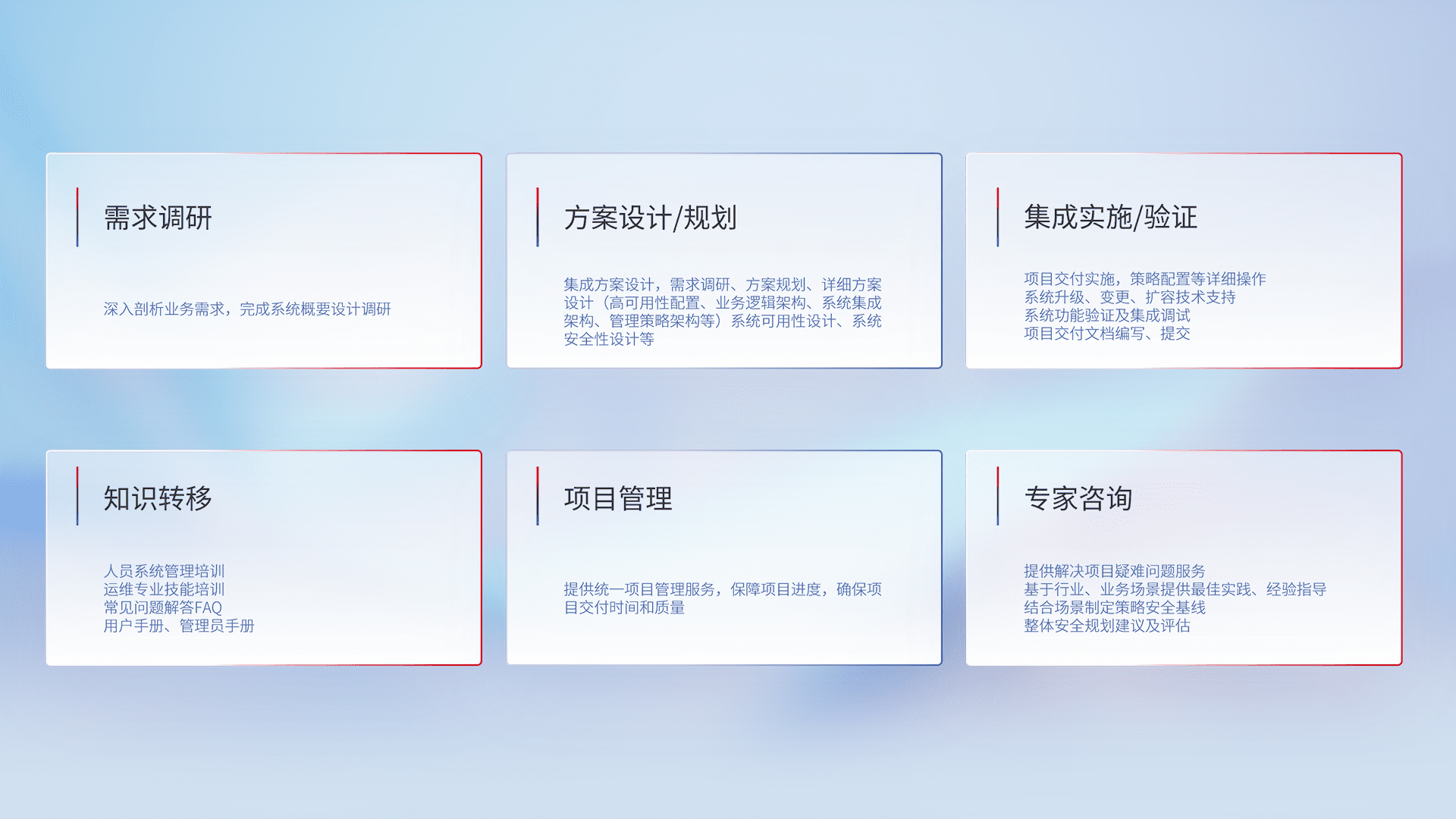 针对客户行业特性,,将宏观的安全战略和需求,,,,通过专业的交付服务,,,实现项目落地,,,为客户提供标准规范的集成交付服务。。